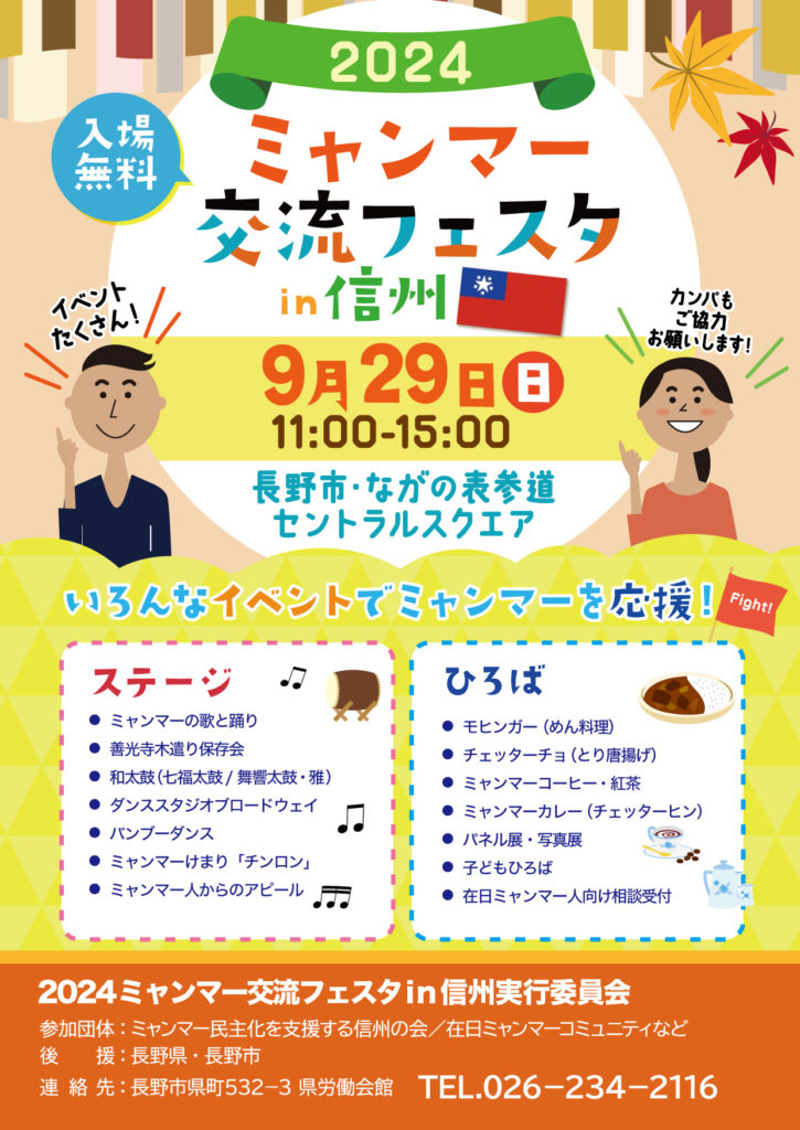 ミャンマーの民主化支援を目的とした「ミャンマーフェスタin信州」が昨年に引き続き今年も開催されました。AISCCは主催団体である「ミャンマー民主化を支援する信州の会」の構成メンバーとして、運営の一翼を担っています。