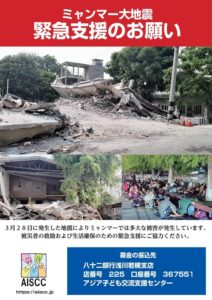 本日28日でミャンマー地震発生から1ケ月が経ちました。 被災地の復旧復興は進んではおらず、被災地の生活は不安定な状況が続いています。 AISCCではこれまで、緊急支援として飲料水、食料、医薬品、ブルーシート、テント、発電 […]